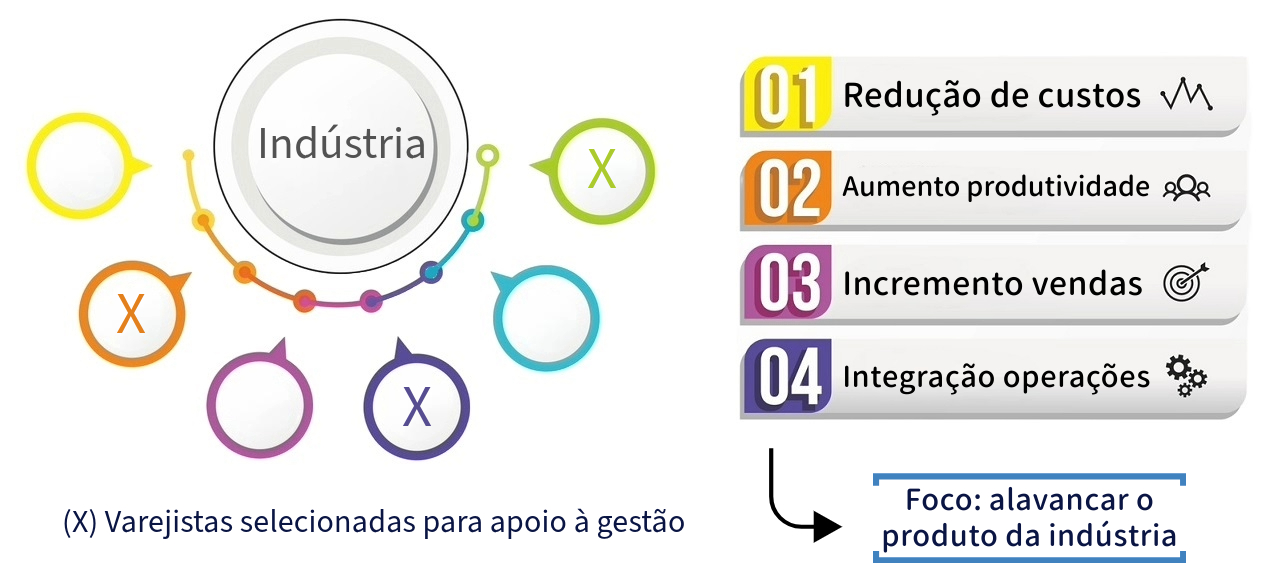 A indústria é a contratante dos benefícios e o foco do trabalho é o de alavancar o(s) produto(s) da indústria contratante por meio do fortalecimento da gestão da varejista parceira e estratégica via redução de custos, aumento de produtividade, incremento de vendas e integração de operações;